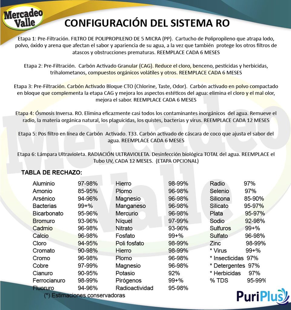 6 ETAPAS: SEDIMENTOS PP 5micra + CARBON GRANULAR GAC + CARBON BLOQUE CTO + RO OSMOSIS INVERSA + T33 CARBON CASCARA COCO 5 + LUZ UV 6 WATTIOS
