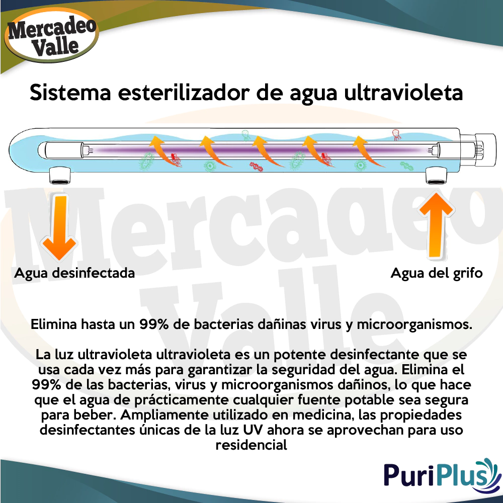 Es la sexta etapa de filtración, la luz UV ofrece una desinfección del agua instantánea, segura, efectiva, es una opción ambientalmente adecuada, no cambia las propiedades del agua y no tiene efectos negativos. Ofreciendo el mejor costo – beneficio y está comprobada como una de las mejores formas de desinfección del agua.